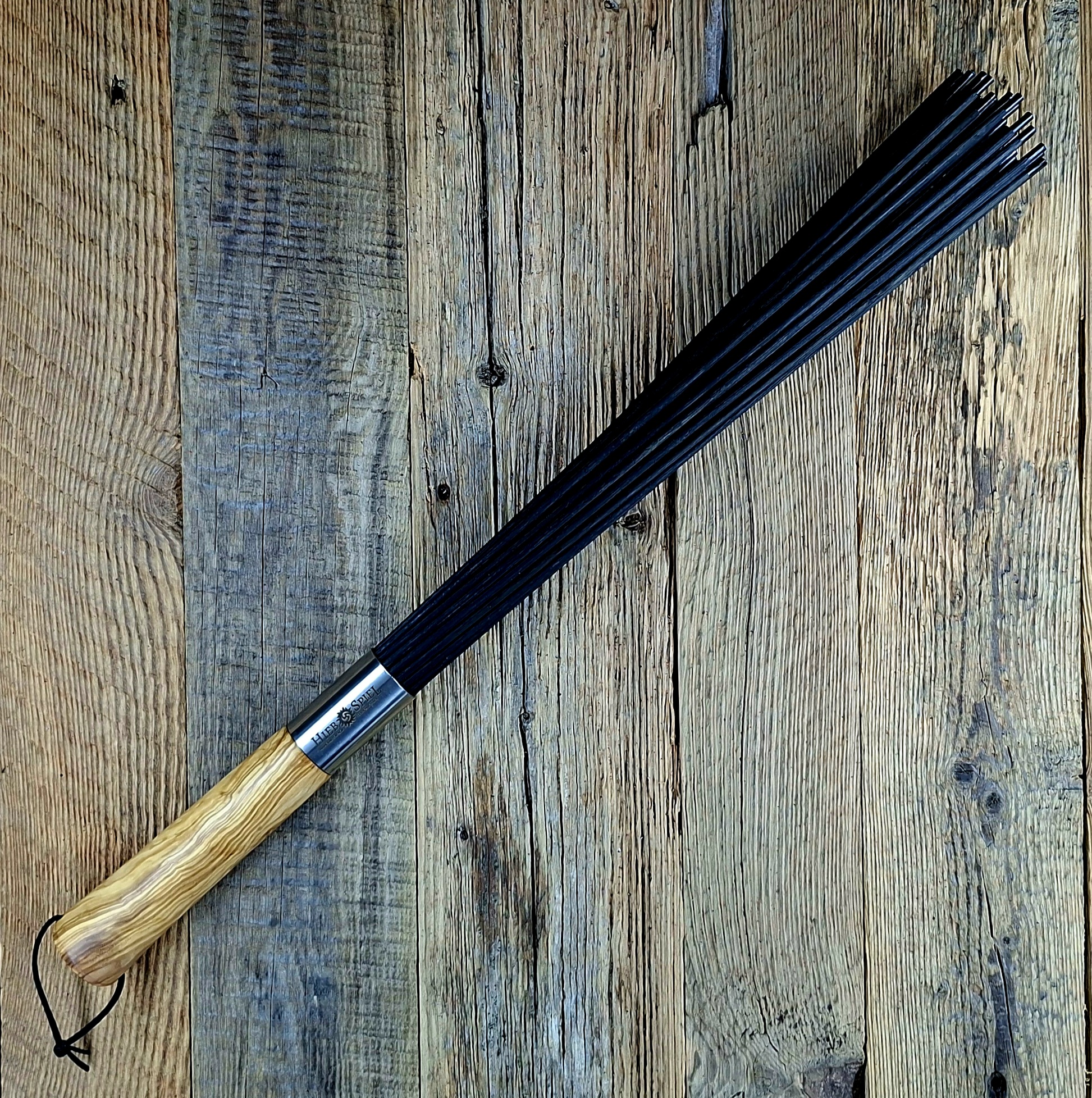 Peitsche aus ca. 37 Bambusstäben zu jeweils 4 mm Durchmesser in einem geraden Griffstück aus Nussbaumholz.