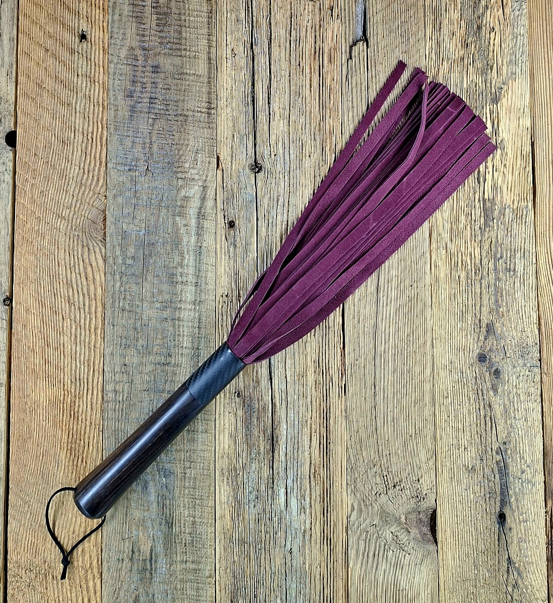 Wunderschöner Leder-Flogger aus bordeauxfarbenem Kalbveloursleder. Das Leder ist beidseitig aufgeraut, soft und robust. Das Griffstück besteht aus edlem Grenadilholz. Es gehört zu den teuersten Hölzern weltweit. Wir haben es mit einer Carbonhülse versehen, was ihm einen sehr edlen Auftritt gibt. Das Griffstück ist konisch geformt und liegt fantastisch in der Hand. Der Flogger ist ideal zum Aufwärmen und kann auch noch etwas mehr.