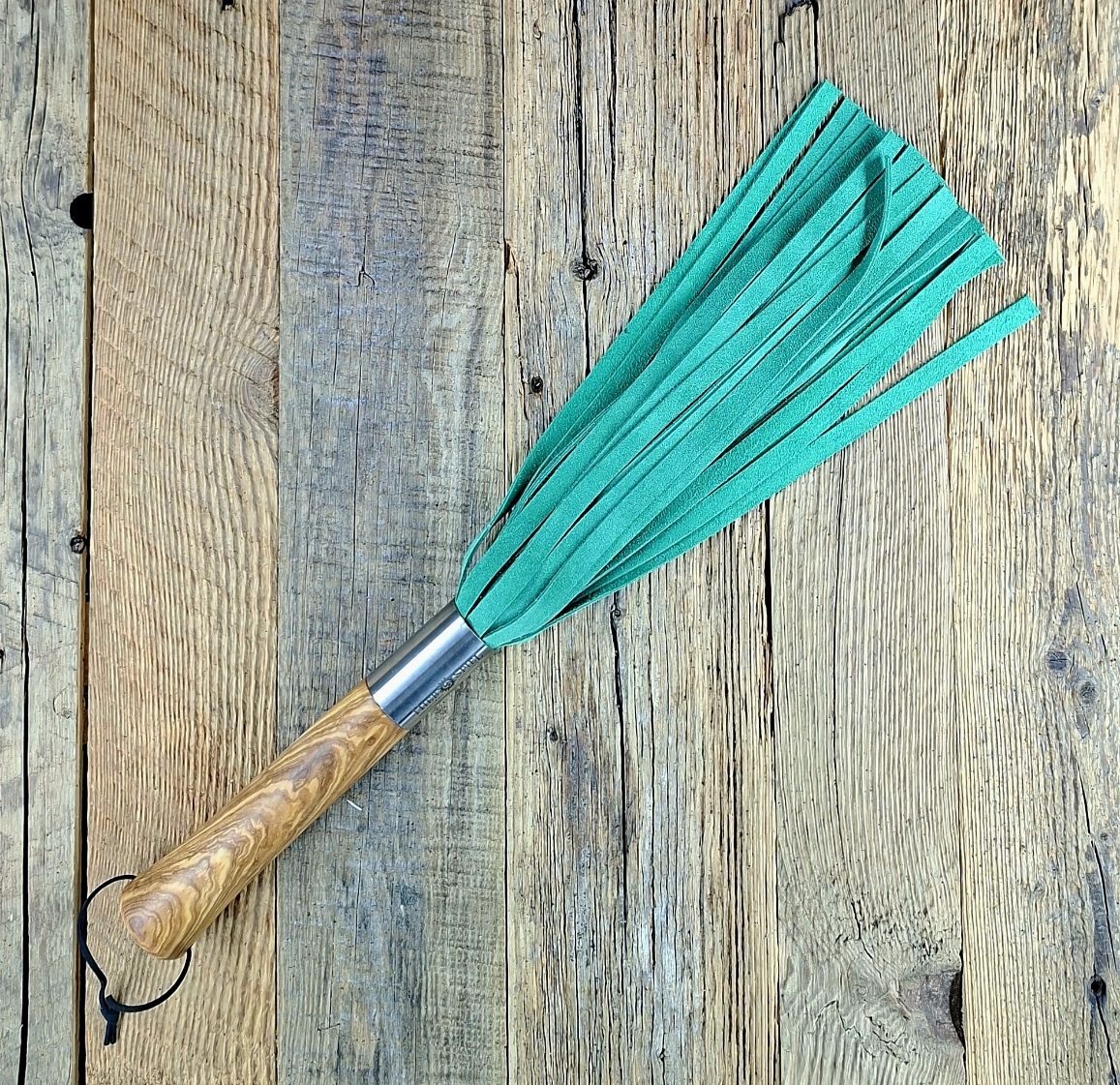 Wunderschöner Leder-Flogger aus grünem Kalbveloursleder. Das Leder ist beidseitig aufgeraut, soft und robust. Das Griffstück besteht aus edler wild gemaserter venezianischer Olive. Der Flogger ist ideal zum Aufwärmen und kann auch noch etwas mehr.