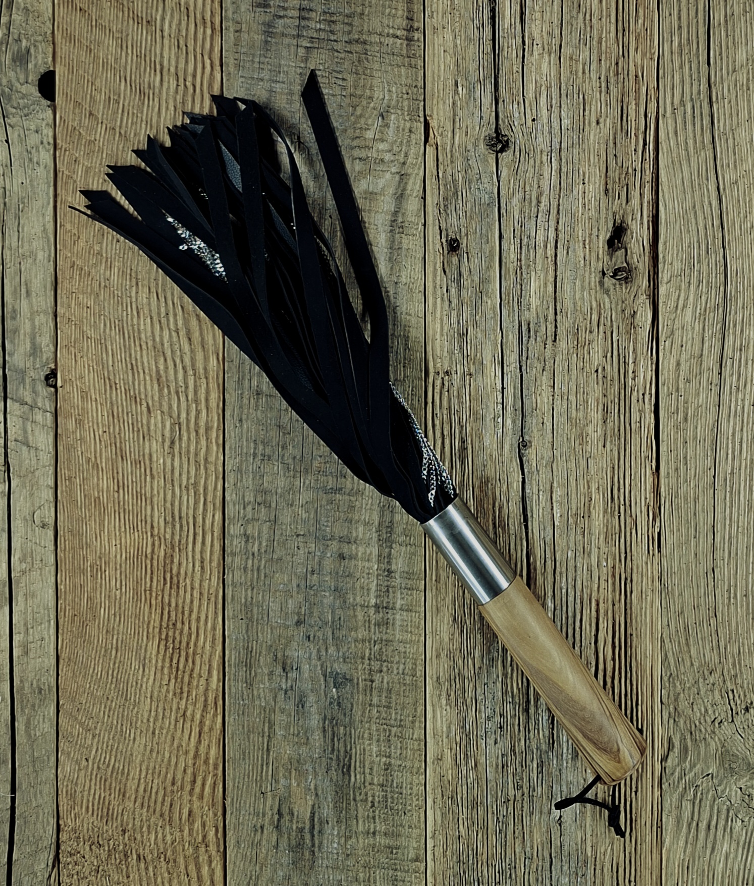 Fieses Lämmchen – schwarzes supersoftes Lammleder mit Kettensträngen – Griff aus Zebranoholz