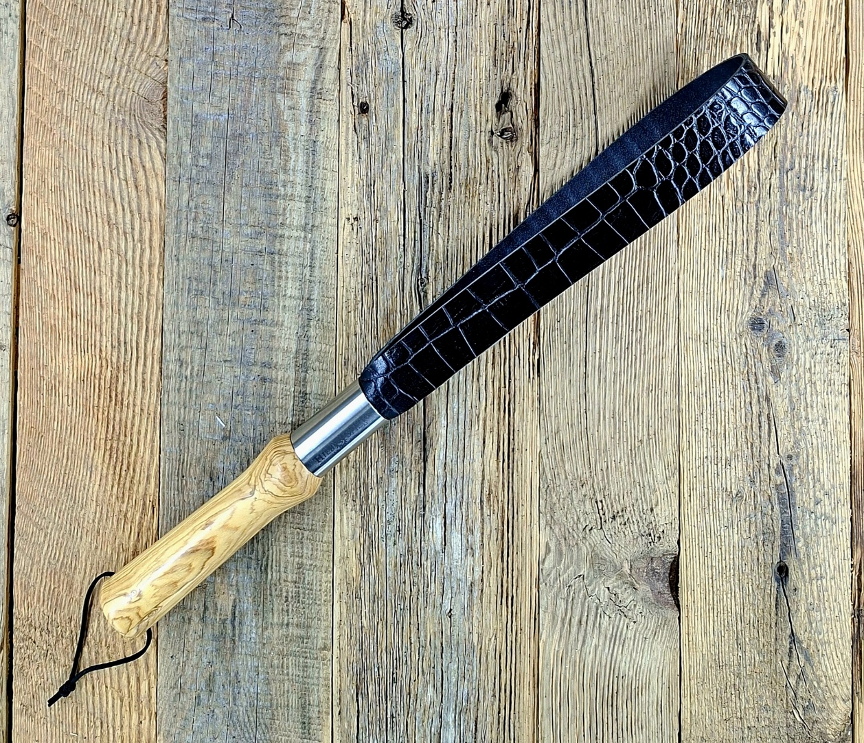 Mit dem Teil könnt Ihr es krachen lassen. Dickes und sehr festes Kalbsleder in Krokooptik wirkt definitiv nachhaltig und hinterlässt Spuren. Das Griffstück besteht aus venezianischer Olieve und ist 19 cm lang. Es ist für normale wie für größere Hände geeignet. Durchmesser 35-38 mm. Die Gesamtlänge der Klatsche beträgt ca. 46 cm. Die Lederbreite 3 cm.