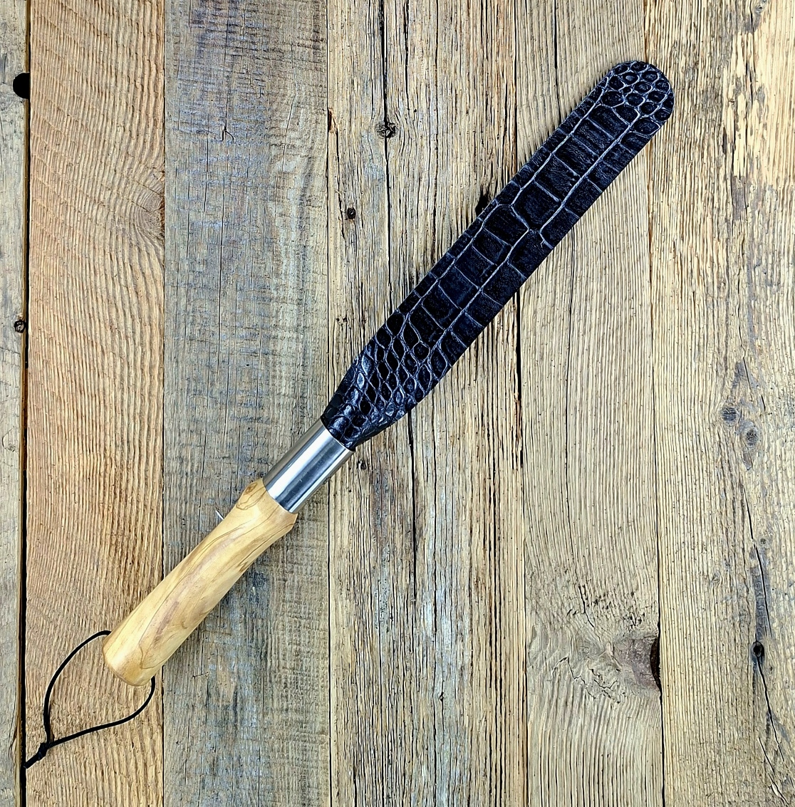 Fiese Drachenzunge aus ca. 4 mm starkem schwarzem Rind-Gürtelleder. Das Griffstück besteht aus edlem Black Palmira Holz (auch Palmenholz genannt) Perlholz mit Edelstahlhülse, konische Griffform. Durchmesser ca. 30-34 mm, Länge mit Hülse ca. 19 cm. Das dicke Leder wirkt sehr bissig.