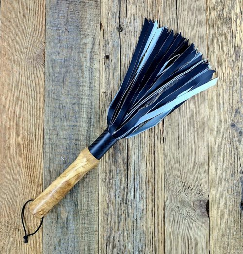 Veganer Flogger aus schwarzem Traubenleder mit einem Griff aus Goldregenholz